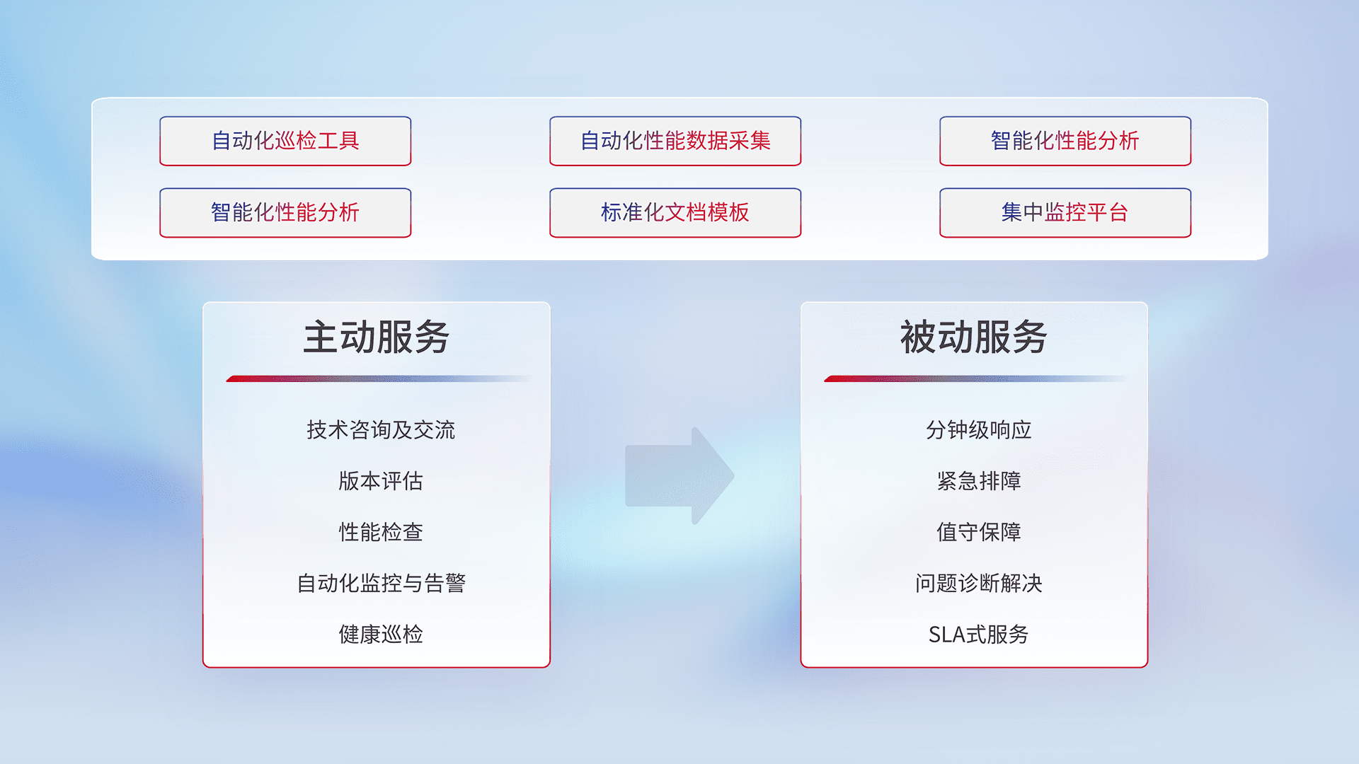 智能化工具和标准化文档,,,,保障服务质量,,,,提供主动服务(包含技术咨询、、版本评估、、性能检查、、、、自动化监控与告警、、、健康巡检)和被动服务包含(分钟级响应、、、紧急排障、、、、值守保障、、、问题诊断解决、、、、SLA服务)。。。